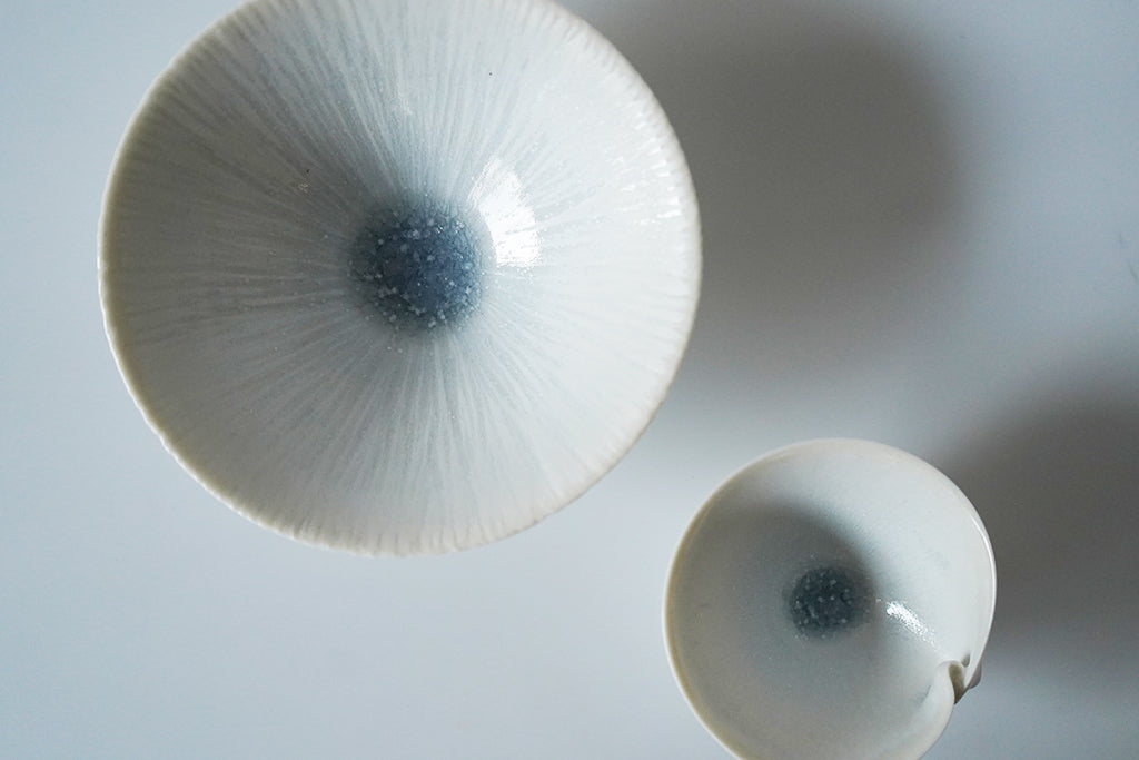 思いと時間をかけて生まれた透明感のある結晶釉奥行きのある色味が静かに佇みうつわを引き立てています植物の色や形、テキスタイル、海外の建造物や民族の織物など様々なものからインスピレーションを受けた、他にはない美しく繊細な象嵌の器も特徴的です