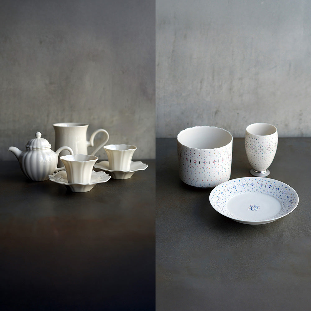 色原さんは、澄んだ透明感をまとう端正な中国茶器を中心に、さまざまなうつわを。西野さんは、薄く繊細なかたちに、細かな象嵌模様を丹念に施します。
